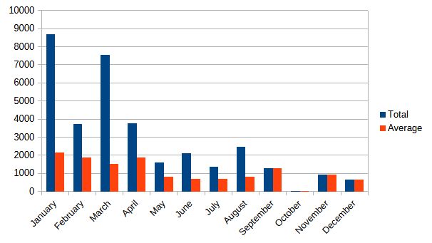 We can clearly see a decline in number of words and posts over the whole year. From September on, we just have one article. I took a long vacation in October, so that at least explains the big gap there at least. There was definitely less motivation to write something. Partly because I didn't know what to write and most of my ideas didn't seem good enough.